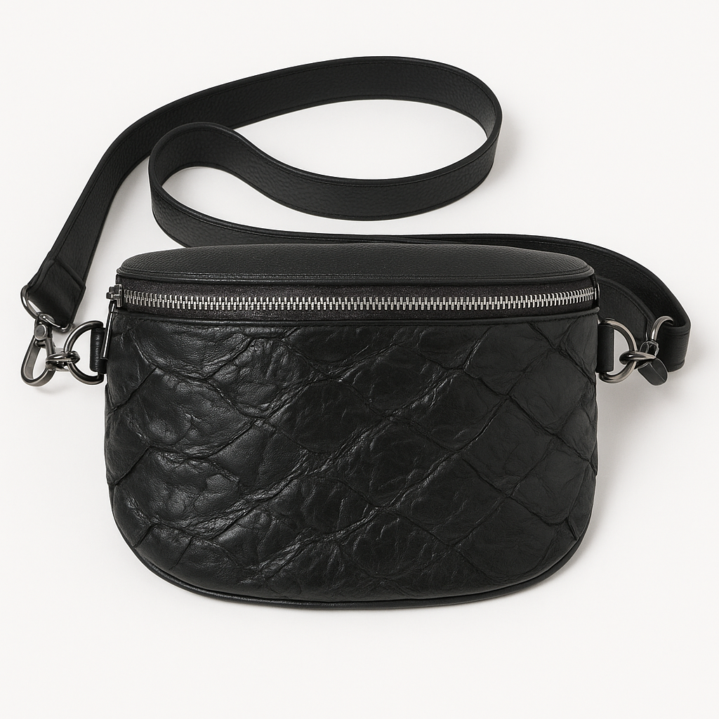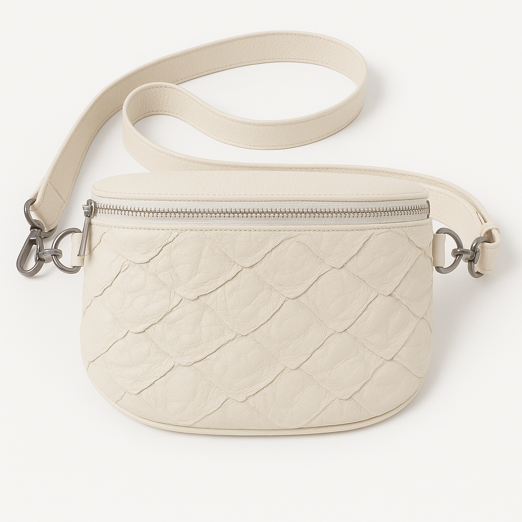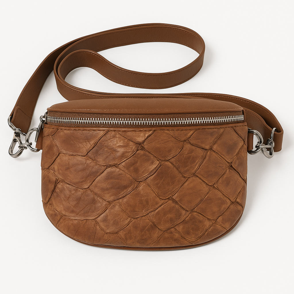 Pochete em couro legítimo de pirarucu, com textura natural e acabamento sofisticado. Possui zíper metálico e alça ajustável e removível. Versátil, pode ser usada na cintura ou a tiracolo. Ideal para looks modernos e elegantes.