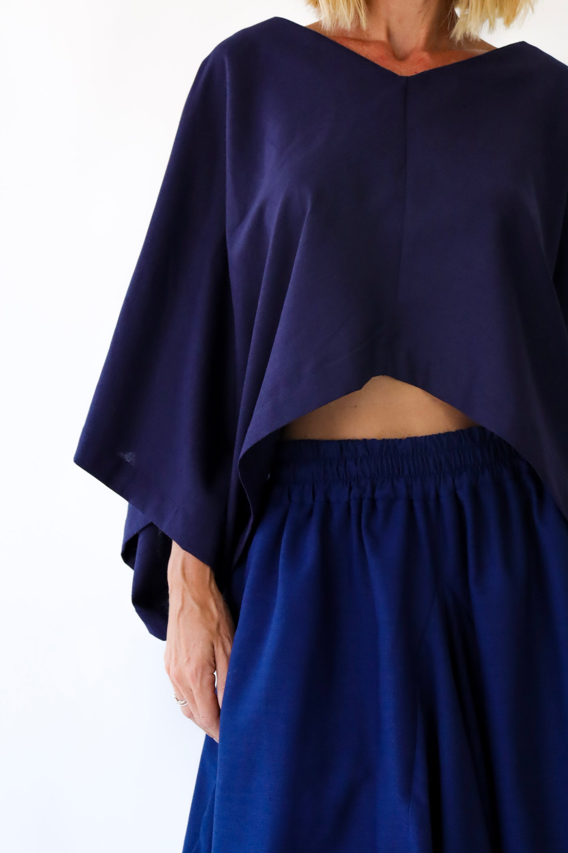 Saia midi, modelo desconstruído, cós com elástico aplicado, bolsos laterais, detalhe de recortes, barra simples.