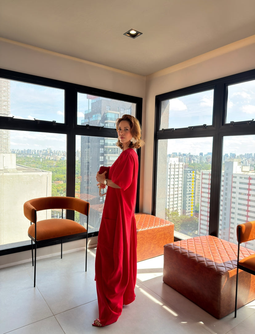 Vestido longo em viscose, com caimento leve e bolsos frontais. Modelo versátil que pode ser usado dos dois lados — com o decote fechado ou invertido, criando um visual mais moderno.