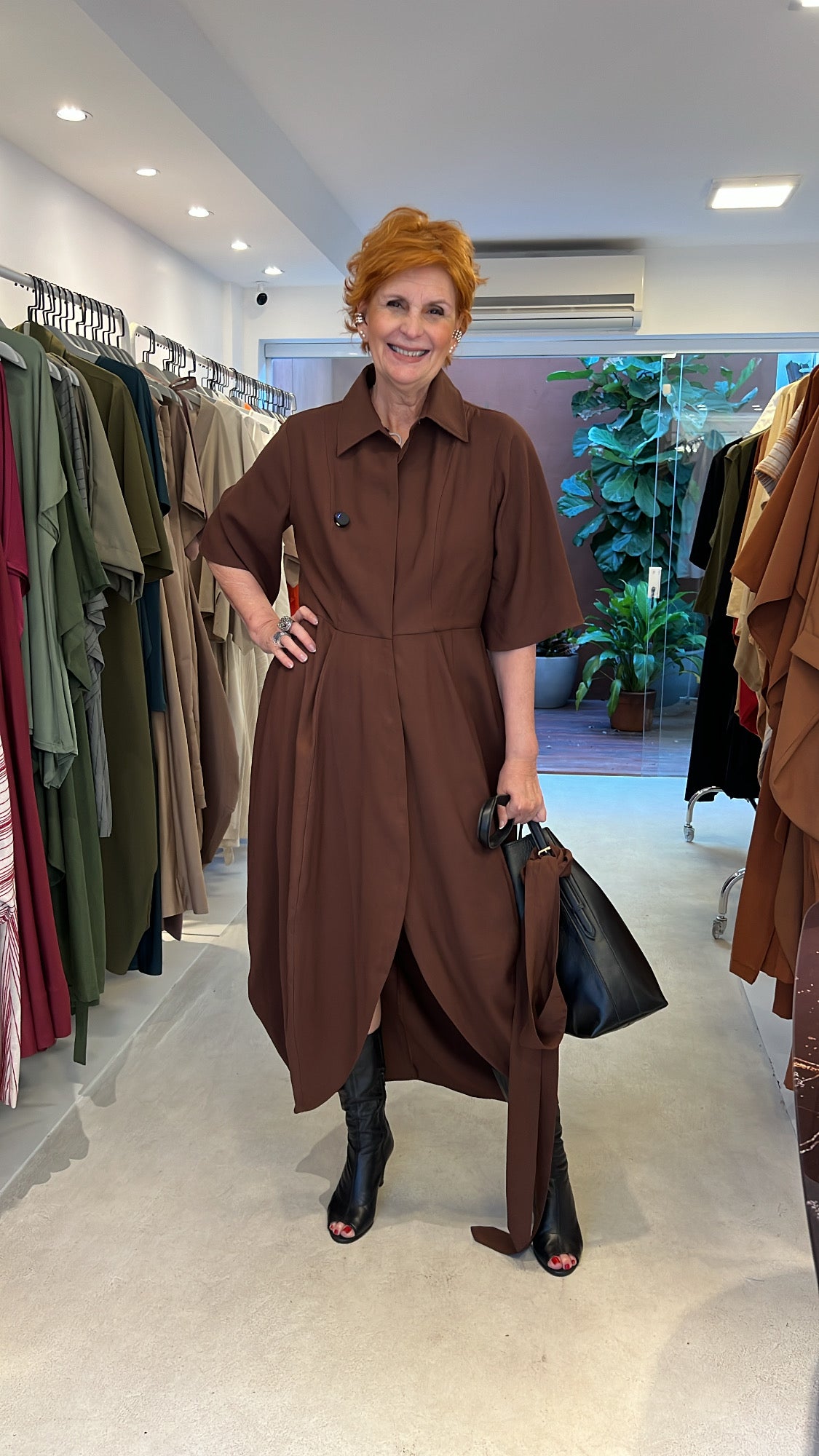 Vestido tulipa em viscose encorpada, com modelagem ampla e mangas curtas evasê. Possui gola de abas largas, fechamento frontal oculto e faixa opcional para amarração na cintura, permitindo diferentes propostas de uso. O caimento fluido e a barra arredondada conferem movimento e sofisticação ao visual.